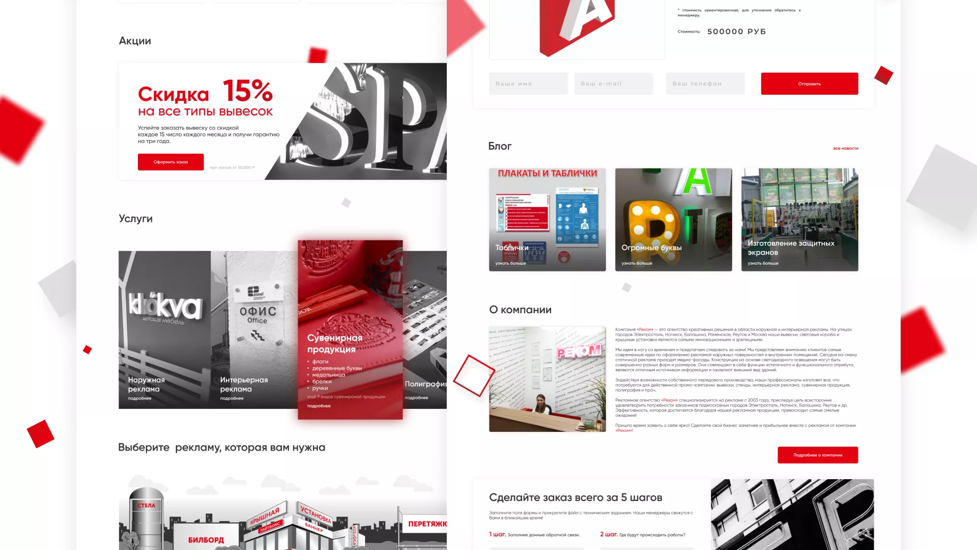 Стаж рекламно-производственной компании «РЕКОМ» — более 15 лет. Компания оказывает полный спектр услуг в Сегеже по интерьерной и наружной рекламе, а также по широкоформатной печати и полиграфии.